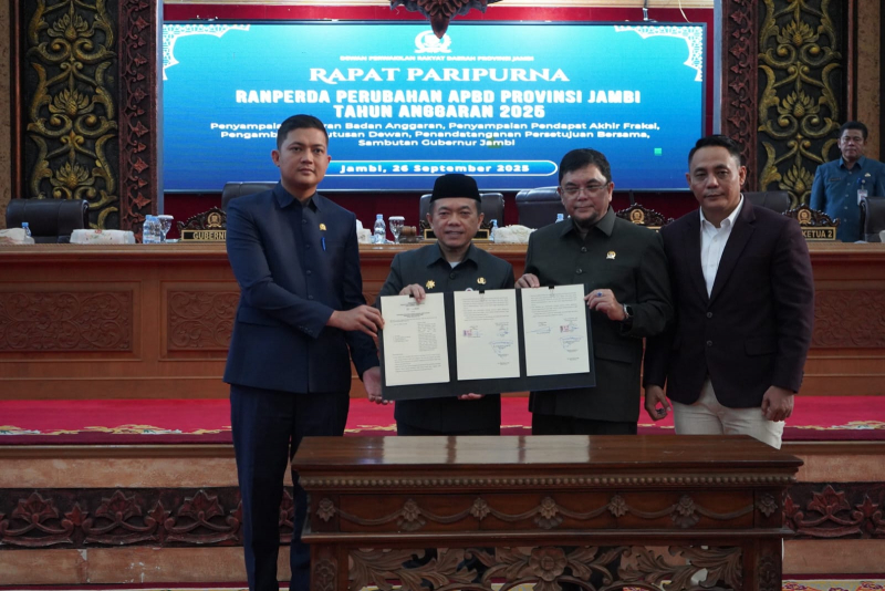 Jambi- DPRD Provinsi Jambi mengesahkan Perubahan APBD Provinsi Jambi tahun 2025 melalui sidang paripurna yang digelar, Jumat (26/9). Penandatanganan persetujuan dilakukan pimpinan DPRD dan Gubernur Jambi.