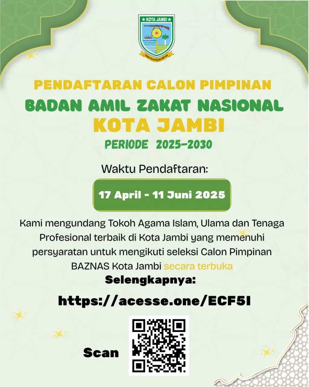 Jambi- Pemerintah Kota Jambi resmi membuka pendaftaran seleksi terbuka calon pimpinan Badan Amil Zakat Nasional (BAZNAS) Kota Jambi periode 2025–2030.