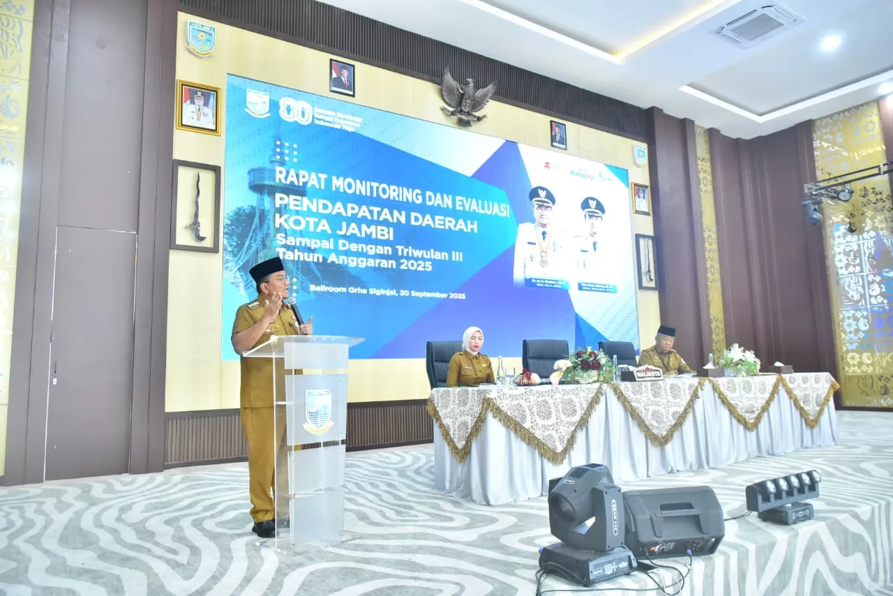 Jambi- Guna memastikan kinerja penerimaan daerah berjalan optimal, Wali Kota Jambi, Dr. dr. H. Maulana, M.K.M., bersama Wakil Wali Kota, Diza Hazra Aljosha, S.E., M.A., memimpin langsung Rapat Monitoring dan Evaluasi (Monev) Pendapatan Daerah Kota Jambi Triwulan III Tahun Anggaran 2025. Rapat yang digelar di Aula Grha Siginjal, Kantor Wali Kota Jambi, Selasa (30/9/2025) ini menjadi forum strategis untuk mengukur capaian, sekaligus memperkuat langkah percepatan peningkatan pendapatan daerah.