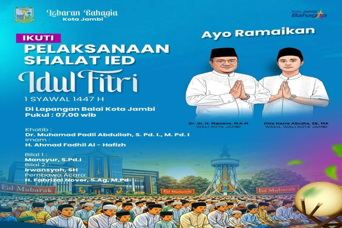 “Pemkot Jambi mengundang seluruh masyarakat Kota Jambi untuk bersama-sama melaksanakan salat Idul Fitri berjamaah di lapangan utama Kantor Wali Kota Jambi. Ini bukan hanya ibadah, tetapi juga momentum memperkuat ukhuwah dan kebersamaan di hari yang fitri,” ucapnya.